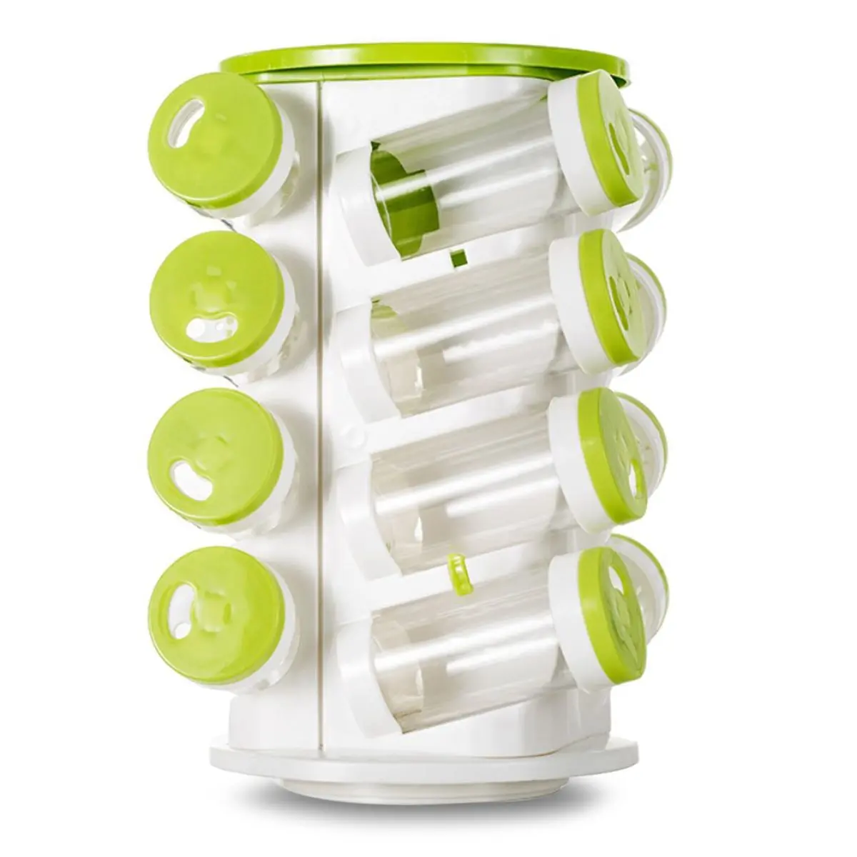 Ordená tus especias con un toque de color y funcionalidad gracias a este especiero giratorio con 16 frascos, cada uno con tapita verde. Su base giratoria 360° permite acceder fácilmente a cualquier condimento, mientras que sus frascos transparentes facilitan la identificación rápida de cada especia. Ideal para mantener la mesada organizada y tus condimentos al alcance.